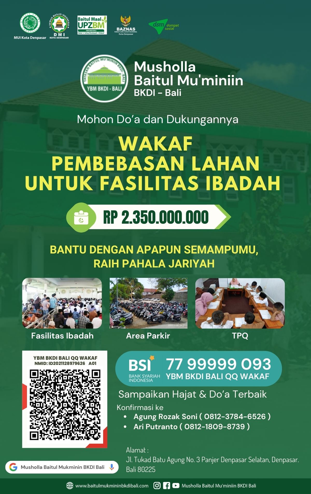 Kesempatan bagi kita semua untuk beramal jariyah dalam program Pembebasan Lahan Untuk Fasilitas Ibadah di Musholla Baitul Mu'miniin BKDI Bali. lokasi lahan yang dimaksud berada di sebrang utara musholla seluas 3 are dengan nilai transaksi sebesar Rp 2.350.000.000 (Dua Milyar Tiga Ratus Lima Puluh Juta Rupiah)